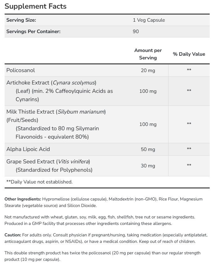 Съставки: Поликозанол, екстракт от артишок, екстракт от бял трън (силимарин), алфа липоева киселина, екстракт от гроздови семки