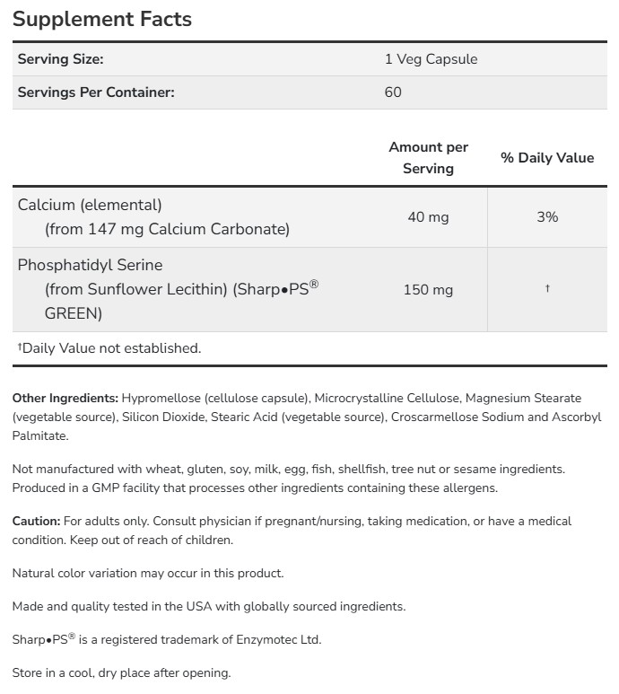 Съставки: Фосфатидилсерин (от слънчогледов лецитин – Sharp•PS® GREEN), калций (от калциев карбонат)