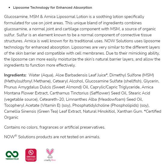 Свойства и предимства на Glucosamine, MSM & Arnica Liposomal Lotion от NOW: