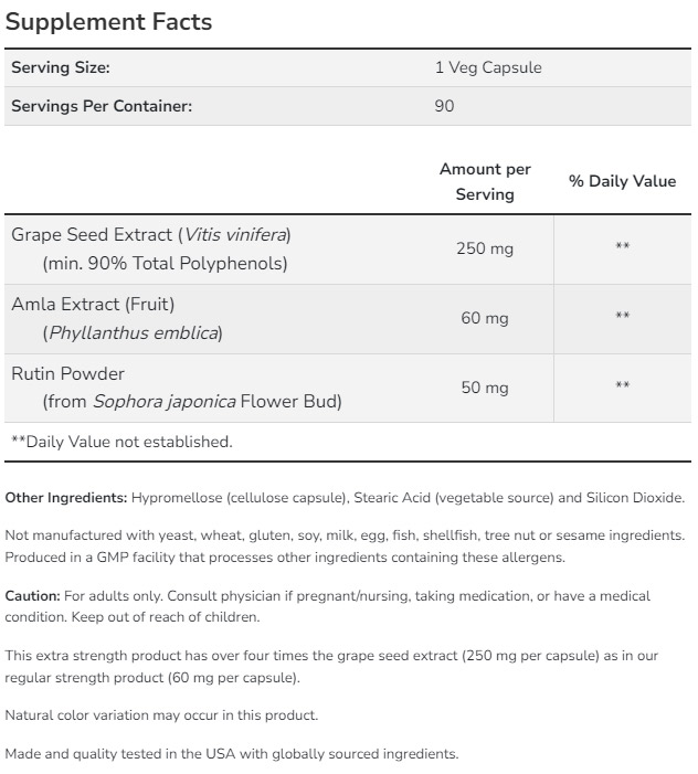 Grape Seed 250 mg Extra Strength комбинира три мощни съставки с доказано действие. Екстрактът от гроздови семки е богат на полифеноли, които предпазват клетките от оксидативен стрес и подпомагат здравето на кръвоносните съдове. Екстрактът от амла, известен като индийско грозде, е източник на натурален витамин C, който засилва имунната система и подпомага антиоксидантната защита. Рутинът е биофлавоноид, който укрепва капилярите, подобрява циркулацията и намалява риска от съдови проблеми.