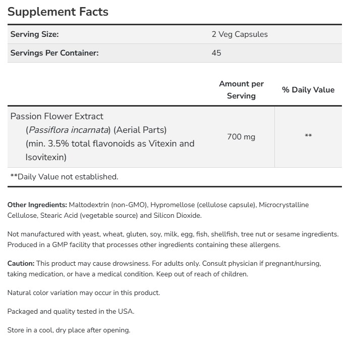 Съставки: Екстракт от пасифлора (Passiflora incarnata), стандартизиран до 3.5% флавоноиди