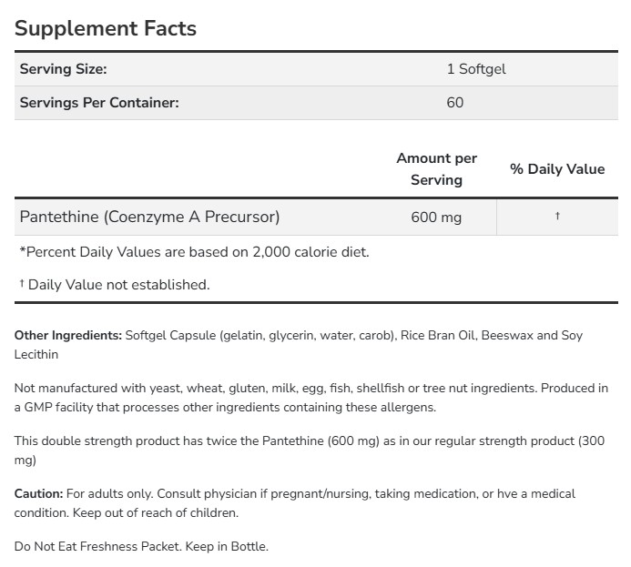 Pantethine от NOW съдържа 600 mg пантетин във всяка софтгел капсула – два пъти повече от стандартната форма на продукта. Пантетинът е биологично активен предшественик на коензим A, който играе ключова роля в метаболизма на мастни киселини, както и в процесите на енергийно производство. Тази по-висока доза е особено подходяща за хора с повишени нива на холестерол, засилено физическо натоварване или хроничен стрес, както и за онези, които търсят ефективна подкрепа за черния дроб и метаболитното здраве.