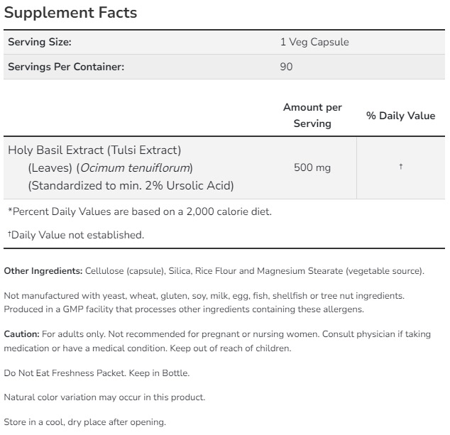 Holy Basil Extract 500 mg съдържа екстракт от свещен босилек (Tulsi) (Ocimum tenuiflorum), стандартизиран до 2% урсолова киселина, която притежава мощни антиоксидантни и адаптогенни свойства. Свещеният босилек е традиционно използван в аюрведичната медицина за намаляване на стреса, укрепване на имунната система и подпомагане на организма в справянето с оксидативния стрес. Освен това, той спомага за балансиране на нивата на кортизол и има благоприятен ефект върху нервната система и цялостното благосъстояние.