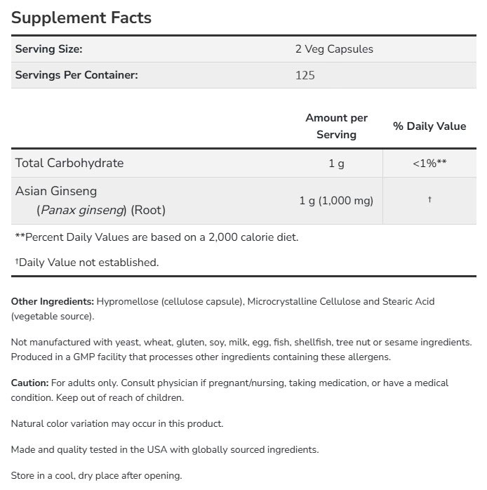 Panax Ginseng от NOW съдържа 1000 mg екстракт от корен на азиатски женшен (Panax ginseng) на доза. Женшенът е сред най-популярните адаптогенни билки и традиционно се използва за подобряване на тонуса, жизнеността и общата работоспособност. Продуктът е подходящ за ежедневна подкрепа при натоварен начин на живот.