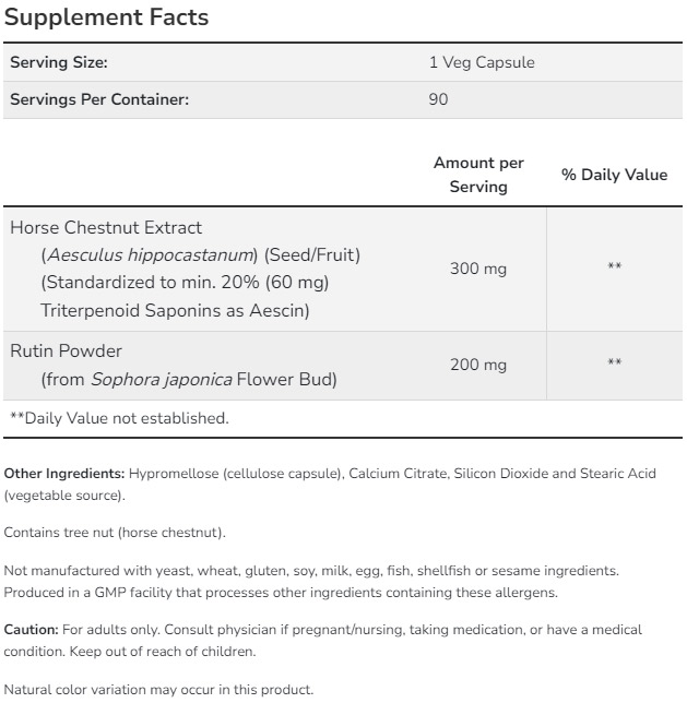 Horse Chestnut 300 mg съдържа екстракт от див кестен (Aesculus hippocastanum), стандартизиран до 20% есцин – активен компонент с мощни венотонични и противовъзпалителни свойства. Есцинът укрепва стените на вените и капилярите, подпомага циркулацията и намалява задържането на течности, което води до по-лека и комфортна чувствителност на краката. Формулата е обогатена с рутин, биофлавоноид, който допълнително подпомага еластичността и здравината на кръвоносните съдове.