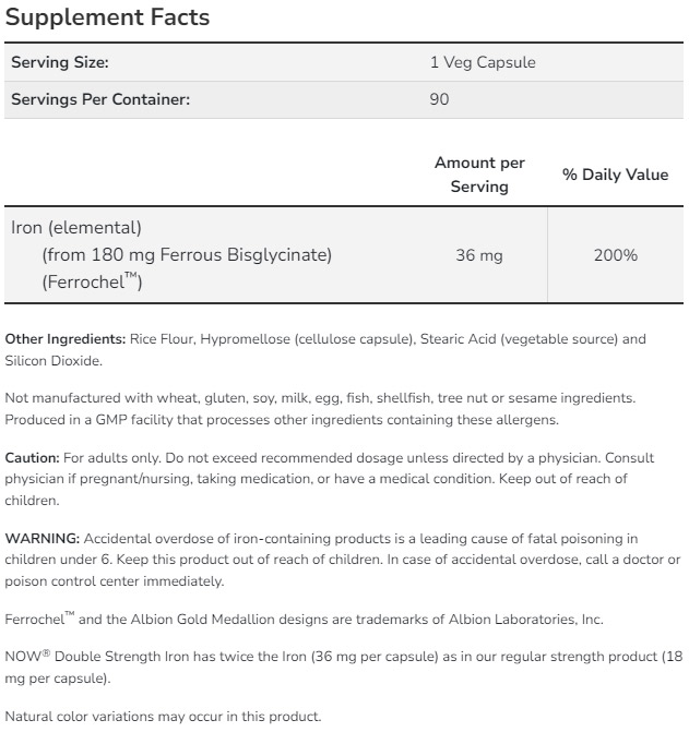 Iron Double Strength от NOW е високоефективна добавка с двойно по-висока концентрация на желязо, предназначена за поддържане на нормалното образуване на червени кръвни клетки и енергийния баланс. Тя подпомага транспорта на кислород в организма и допринася за намаляване на умората и изтощението.