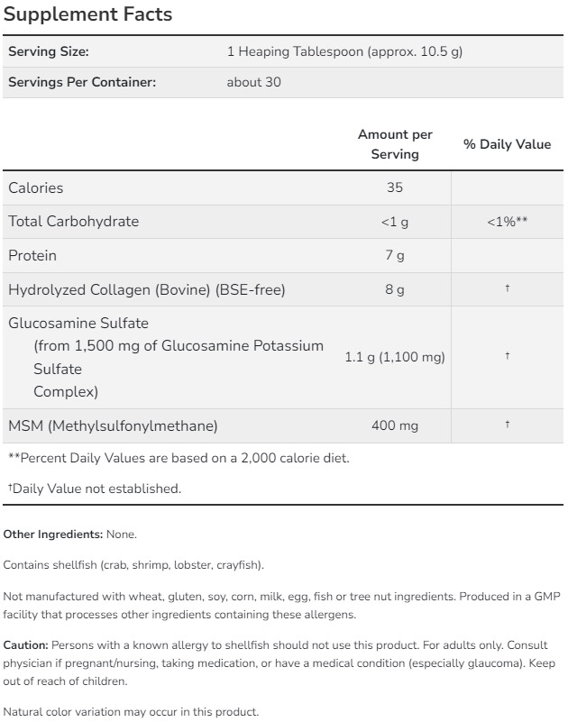 Хидролизираният колаген е основен структурен протеин, който подпомага здравината и еластичността на кожата, костите и ставите. Глюкозамин сулфатът играе ключова роля в изграждането и поддържането на хрущялната тъкан, като допринася за намаляване на дискомфорта в ставите. MSM (Метилсулфонилметан) е естествен източник на органична сяра, която подпомага възстановяването на съединителната тъкан и намалява възпалението.