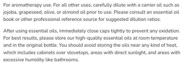 За други приложения – винаги разреждайте с базово масло (жожоба, бадемово, зехтин или гроздови семки). Препоръчително е да се консултирате с източник за съотношения на разреждане.