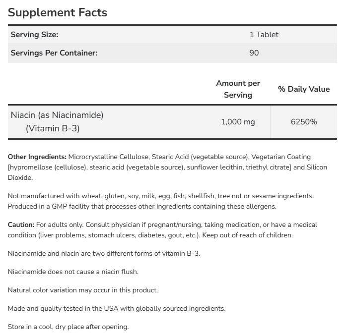 Niacinamide от NOW съдържа 1000 mg ниацинамид – форма на витамин B-3, която не води до характерното зачервяване и затопляне, типични при никотиновата киселина. Подходящ е при повишени нужди от витамин B-3 или като част от обща подкрепа за енергийния обмен и кожното здраве.
