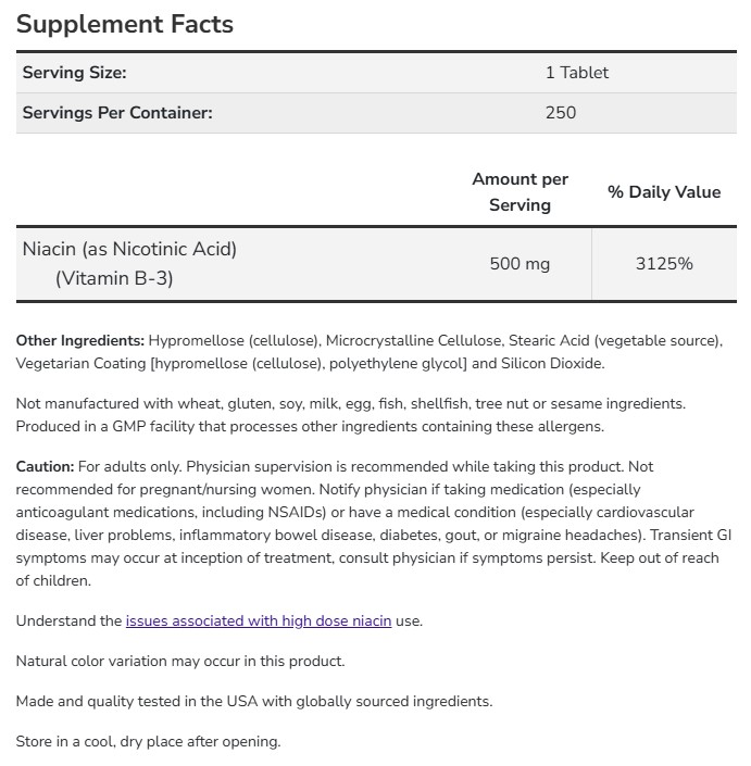 Niacin от NOW осигурява 500 mg витамин B-3 (ниацин) във формата на никотинова киселина – активна форма, която подпомага преработката на въглехидрати, мазнини и протеини в енергия. Ниацинът има ключова роля за нервната система и сърдечно-съдовата функция. Възможно е временно усещане за „ниациново зачервяване“ (flush) – затопляне и зачервяване на кожата, което е нормален ефект при високи дози.