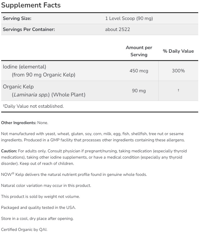 Organic Kelp Powder от NOW съдържа изсушени и фино смлени водорасли ламинария (Laminaria spp.), които са естествен източник на йод. Йодът е ключов минерал за производството на тиреоидни хормони, които регулират енергията, терморегулацията, концентрацията и общия тонус. Подходящ за добавяне към храни, напитки или шейкове.