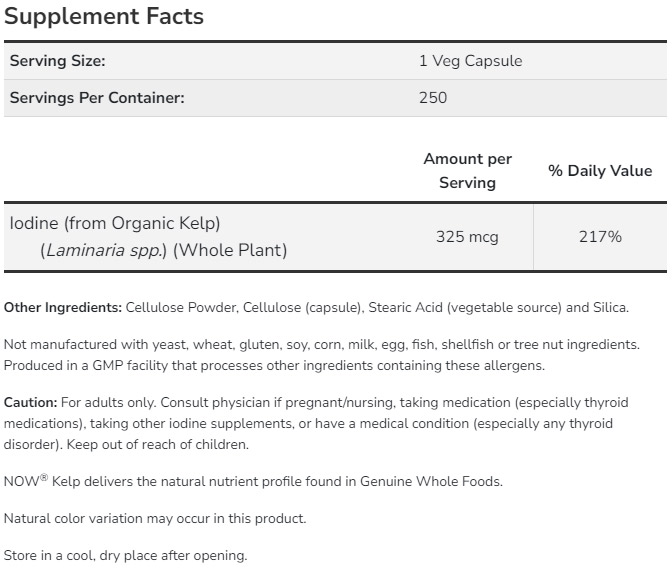 Kelp от NOW е натурален източник на йод, извлечен от органични морски водорасли. Йодът е жизненоважен минерал, който подпомага функцията на щитовидната жлеза и допринася за нормалния енергиен метаболизъм.