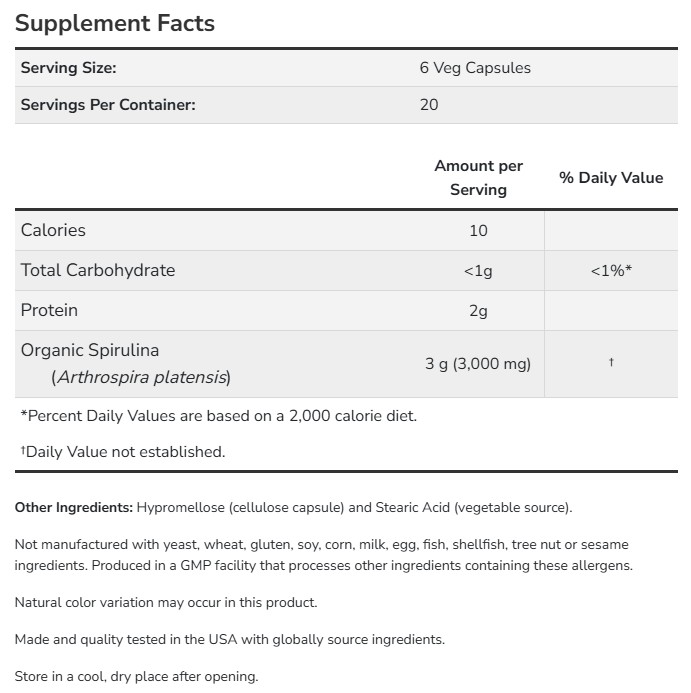 Спирулина е източник на ценни хранителни вещества като витамин B12, желязо, бета-каротин, хлорофил и фикоцианин, които я правят идеална за поддържане на добрия тонус, особено при физическа активност, стрес или ограничено хранене. Тя подпомага също черния дроб и нормалната функция на храносмилателната система. Поради богатия си хранителен профил, спирулината често е наричана „суперхрана“.