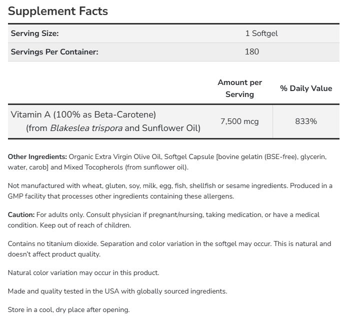 Beta-Carotene Natural 25,000 IU от NOW е висококачествена форма на витамин A, която подпомага зрението, имунната система и здравето на кожата. Бета-каротенът е естествен антиоксидант, който тялото преобразува във витамин A според нуждите си.