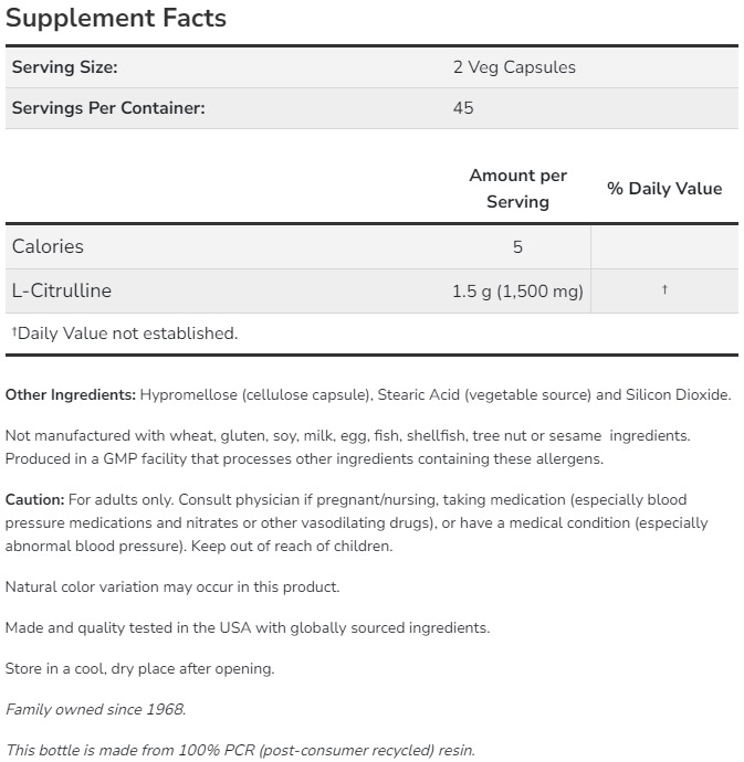Съставки: L-Citrulline, растителна капсула, стеаринова киселина, силициев диоксид