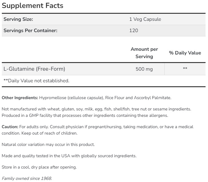 Съставки: L-Глутамин (в свободна форма), растителна капсула, оризово брашно, аскорбил палмитат