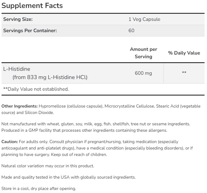 Съставки: L-Хистидин (от L-Histidine HCL), растителна капсула, микрокристална целулоза, стеаринова киселина, силициев диоксид