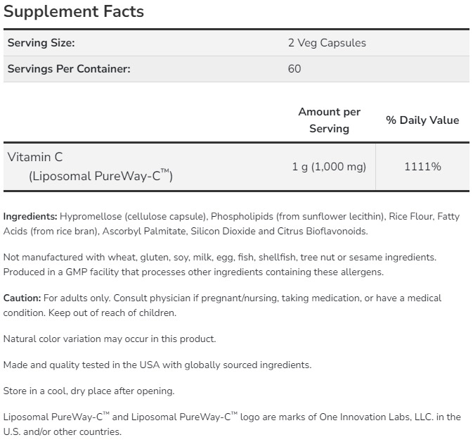 Liposomal Vitamin C съдържа PureWay-C™ – липозомна форма на витамин C, комбинирана с фосфолипиди за по-ефективно абсорбиране и задържане в организма. Допълнителното съдържание на цитрусови биофлавоноиди допринася за по-добро действие на витамина. Формулата не съдържа пшеница, глутен, соя, мляко или животински съставки и е подходяща за хора с различни хранителни режими.