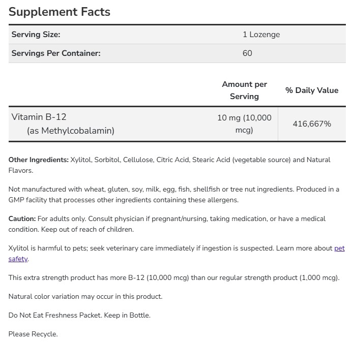 Витамин B12 (като метилкобаламин) е важен за нервите, мозъка и сърдечната система. Често е дефицитен при хора, които не ядат месо, имат проблеми с храносмилането или са под стрес. Тази форма на B12 се усвоява добре от тялото и действа бързо. Таблетките за смучене са лесни за прием и не е нужно да се преглъщат.