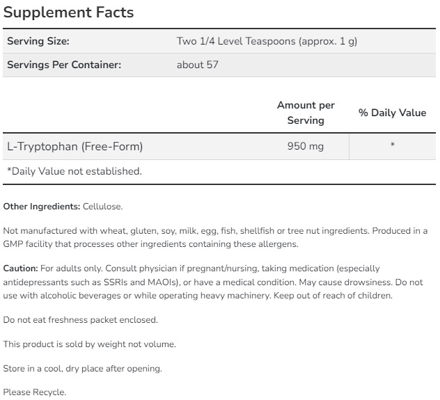 L-триптофанът е от полза при инсомния, тревожност и стрес, като съдейства за постигане на вътрешен баланс и релаксация. Формулата в прахообразна форма позволява прецизен контрол на дозировката според индивидуалните нужди.