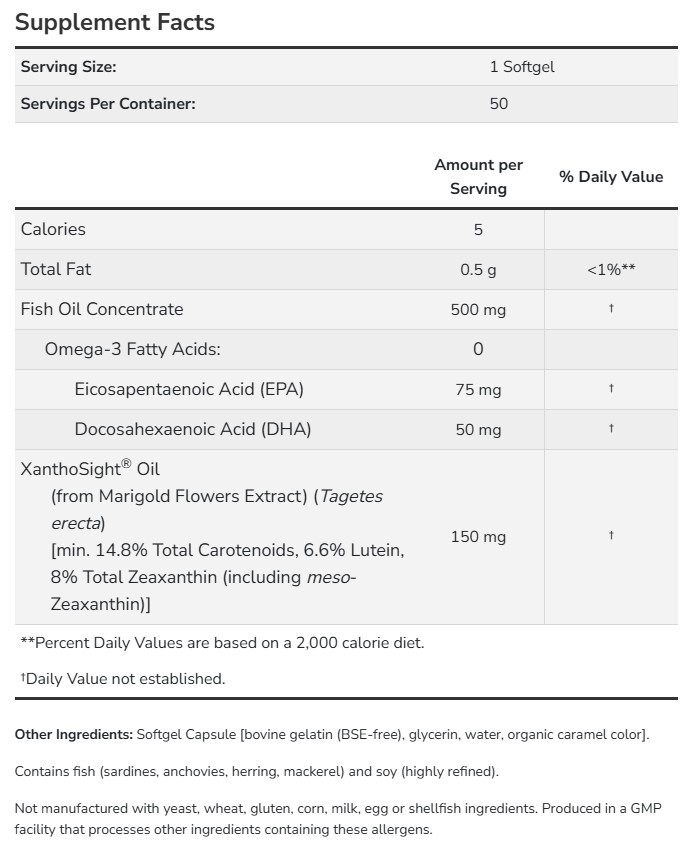 Съставки: Концентрат от рибено масло (с EPA и DHA), XanthoSight® екстракт от невен (с лутеин и зеаксантин)