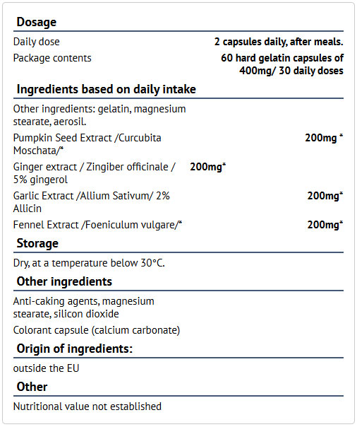 Съставки: Екстракт от тиквено семе, екстракт от джинджифил (5% джинджерол), екстракт от чесън (2% алицин), екстракт от резене