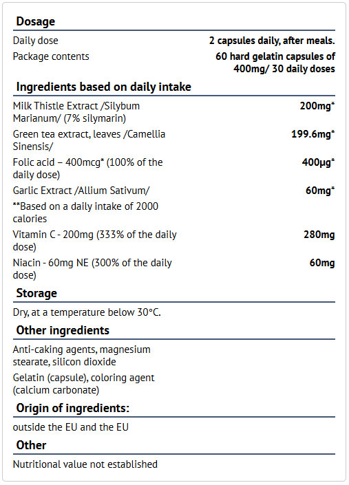 Съставки: Екстракт от бял трън, екстракт от зелен чай, фолиева киселина, екстракт от чесън, витамин C, ниацин