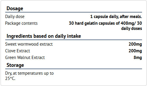 Съставки: Екстракт от сладък пелин, екстракт от карамфил, екстракт от зелен орех
