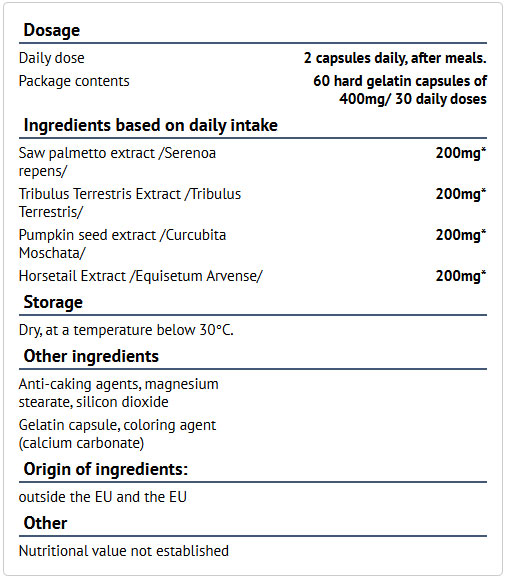 Съставки: Екстракт от сао палмето, екстракт от бабини зъби, екстракт от тиквено семе, екстракт от полски хвощ