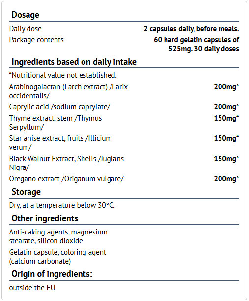 Съставки: Арабиногалактан (от лиственица), каприлова киселина (sodium caprylate), екстракт от мащерка, звездовиден анасон (плодове), черен орех (обелки), риган