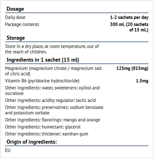 Съставки: Магнезий (магнезиев цитрат), витамин B6, вода, ксилитол, сукралоза, млечна киселина, натриев бензоат, калиев сорбат, ароматизанти (манго и портокал), глицерол, ксантанова гума