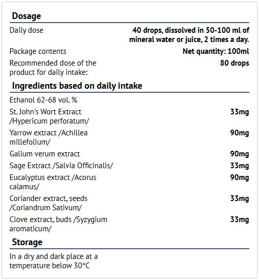Съставки: Екстракт от жълт кантарион, бял равнец, еньовче, салвия, евкалипт, кориандър, карамфил; етанол 62–68 об. %