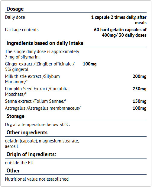 Съставки: Екстракт от джинджифил (5% джинджерол), бял трън (силимарин), тиквено семе, сена (листа), астрагал