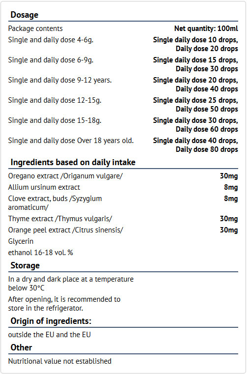 Съставки: Екстракт от риган, екстракт от левурда, екстракт от карамфил, екстракт от мащерка, екстракт от кори портокал, глицерин етанол (16-18 об. %)