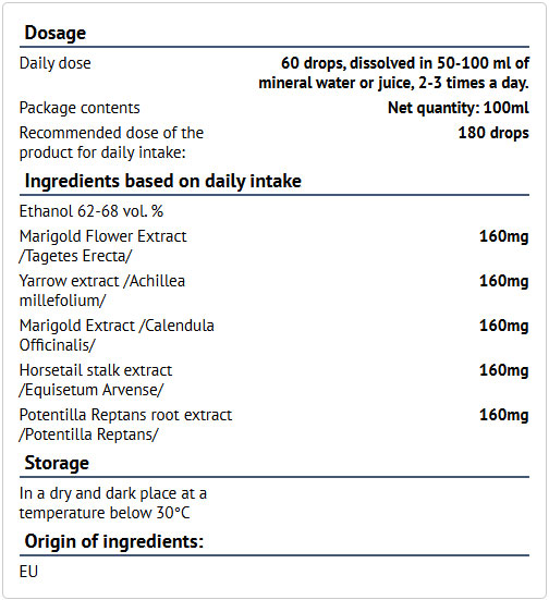 Екстракт от турта, екстракт от бял равнец, екстракт от невен, екстракт от полски хвощ, екстракт от петопръстник, етанол (62-68%)