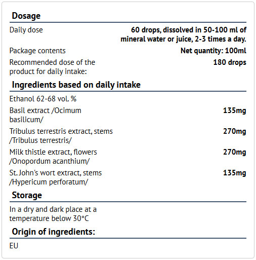 Съставки: Екстракт от босилек, екстракт от бабини зъби, екстракт от магарешки трън, екстракт от жълт кантарион, етанол (62–68 об. %)