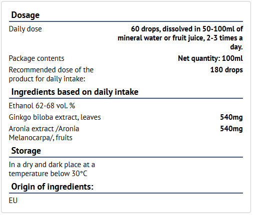 Съставки: Екстракт от гинко билоба (листа), екстракт от арония (плодове), етанол (62–68 об. %)