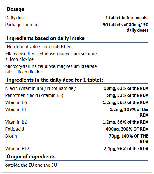 Съставки: Ниацин (B3), пантотенова киселина (B5), витамин B6, витамин B1, витамин B2, фолиева киселина (B9), биотин (B7), витамин B12