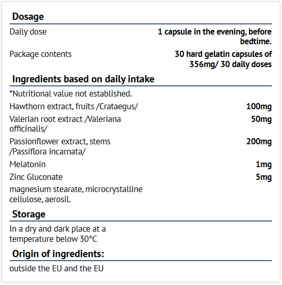 Съставки: Екстракт от пасифлора (стръкове), екстракт от глог (плодове), екстракт от валериана (корен), цинк глюконат, мелатонин