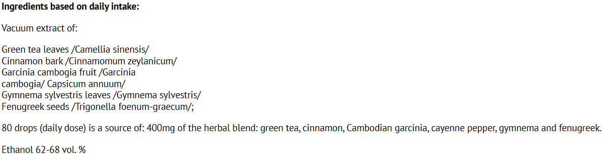 Съставки: Екстракт от зелен чай, канела, гарциния камбоджа, лют червен пипер, гимнема силвестре, сминдух; етанол (62–68 об.%)