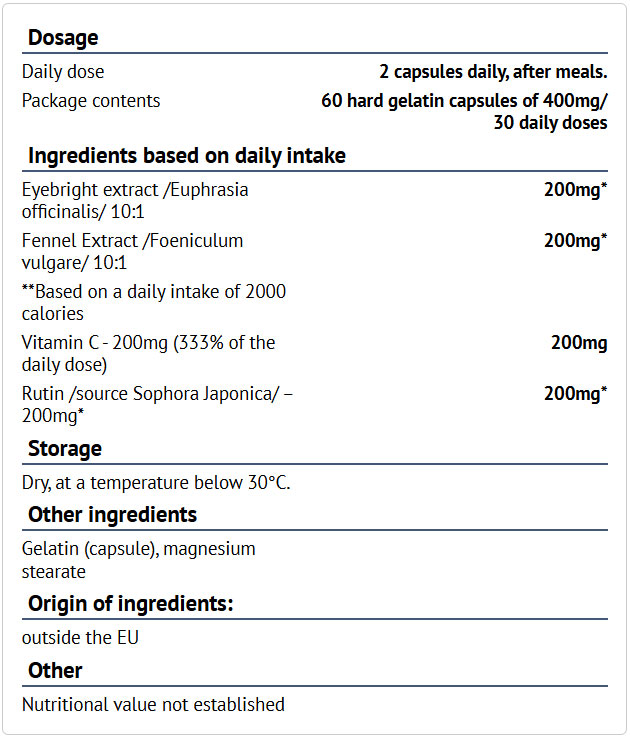 Съставки: Екстракт от очанка, екстракт от резене, витамин C, рутин (от Sophora Japonica)