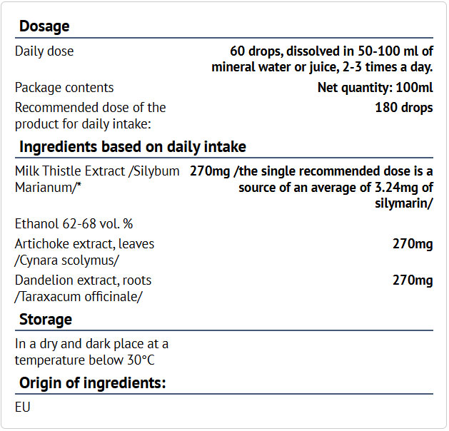 Съставки: Екстракт от Бял Трън, Артишок, Глухарче, етанол (62–68%)