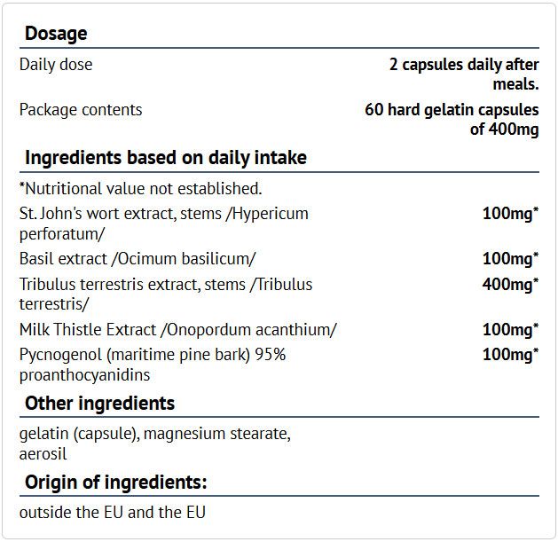 Съставки: Екстракт от Бабини зъби, Жълт кантарион, Босилек, Магарешки трън, Пикногенол