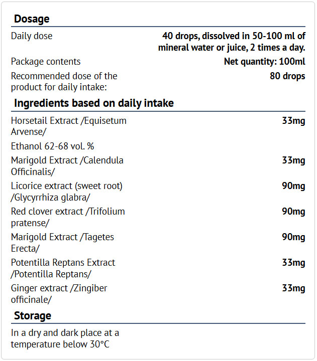 Съставки: Екстракт от Полски хвощ, Невен, Женско биле, Червена детелина, Турта, Петопръстник, Джинджифил, Етанол (62–68 об.%)