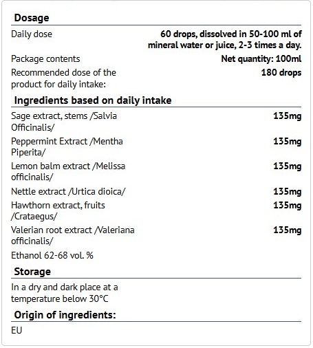 Съставки: Екстракт от салвия, екстракт от мента, екстракт от маточина, екстракт от коприва, екстракт от глог, екстракт от валериан, етанол 62–68%