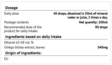 Съставки: Екстракт от гинко билоба (листа), етанол 62–68%