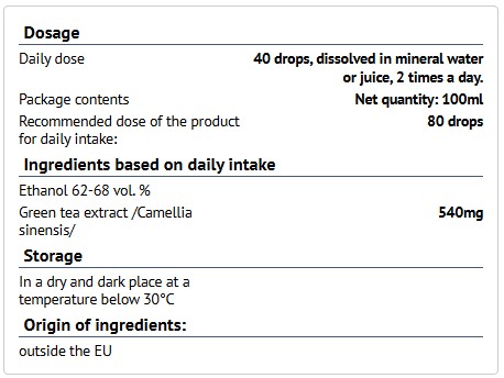 Съставки: Екстракт от зелен чай (Camellia sinensis), етанол 62–68%