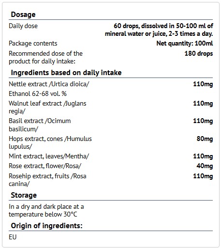 Съставки: Екстракт от Коприва, Орех (лист), Босилек, Хмел (шишарки), Мента (стръкове), Роза (цвят), Шипка (плодове), Етанол 62-68%