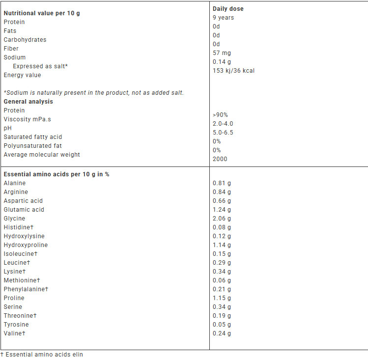 Глицинът и пролинът са основни аминокиселини в колагена, които подпомагат регенерацията на съединителната тъкан. Хидроксипролинът играе ключова роля в стабилността на колагеновата структура. Глутаминовата и аспарагиновата киселина допринасят за възстановяването на мускулите. Формулата е лесна за усвояване и не съдържа мазнини, фибри или захари, което я прави подходяща при различни хранителни режими.