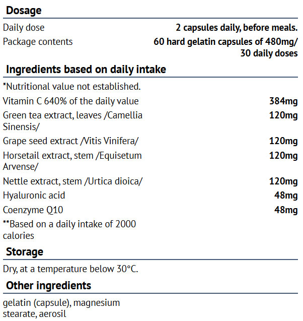 Съставки: Витамин C, екстракт от зелен чай (листа), екстракт от гроздови семки, екстракт от полски хвощ (стрък), екстракт от коприва (стрък), хиалуронова киселина, коензим Q10